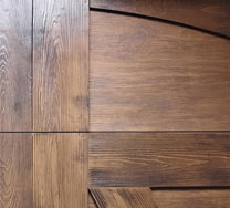 Assembled using a Flush steel panel base and composite wood overlay. The final creation is a one of a kind garage door that has the beauty of wood, but is low maintenance.