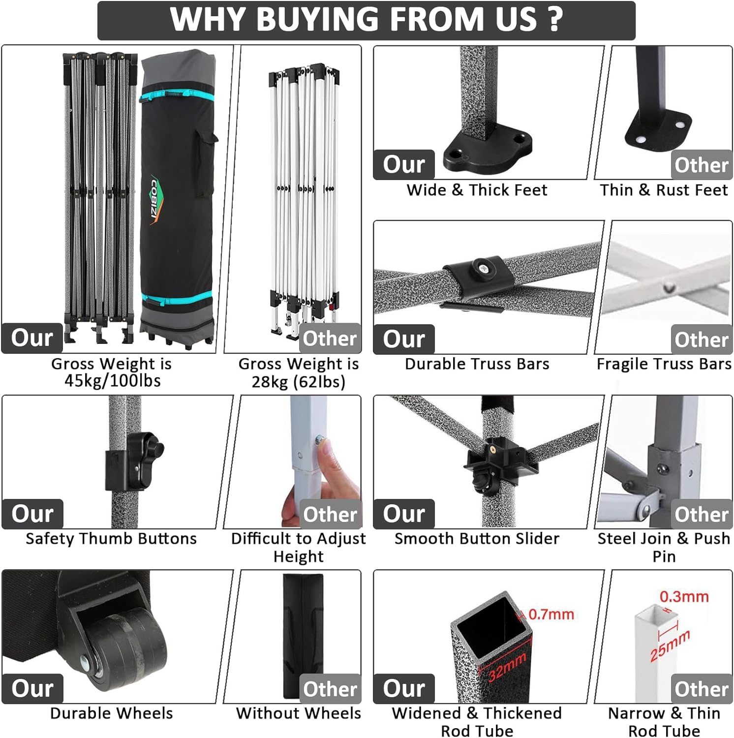 【3 Heights Setting】Canopy tent outdoor gazebo tent for parties 10×20 have 3 height settings . You can quickly and easily adjust three height positions by simply pulling the button outward: 220cm/86.6in, 230cm/90.5in, 240cm/94.5in, no tools required. COBIZI easy pop up canopy tent have upgraded buttons, which are easy to lock and release, adjust to avoid clamping your hand and be safer.