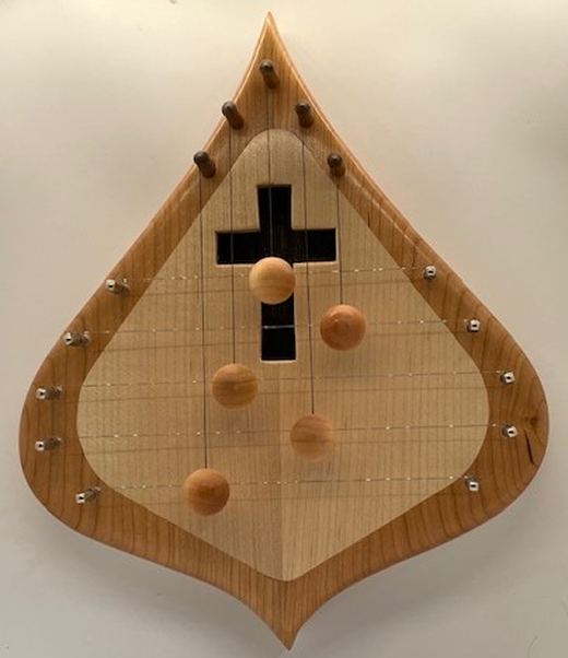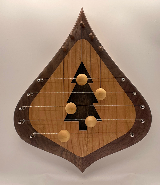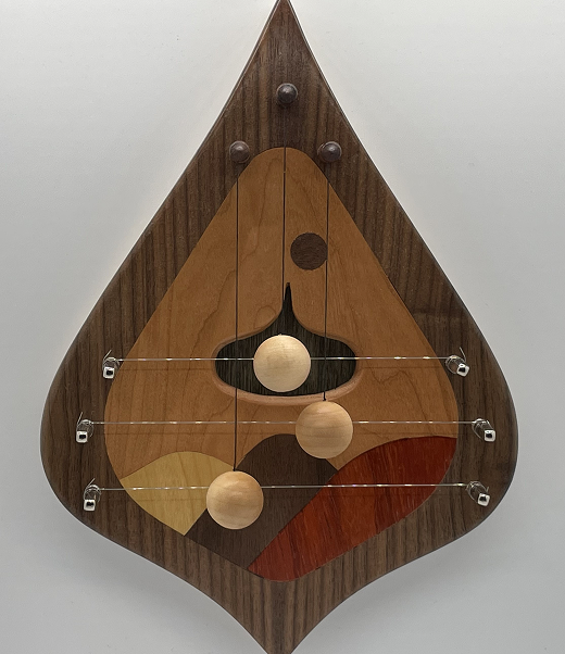 The door harp is a flattened hollow box made from various kinds of hardwood that comes in many different shapes and sizes, with hanging balls that bounce off the strings which are tuned to different notes. The amount of strings can vary from 3 to as many as a dozen (or more!). Traditionally the strings were made of braided silk, however, these days they are usually wire.