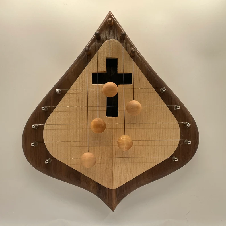 DH3CBMCRS- 3 String door harp with solid Cherry border and natural Maple inlay. This harp has a cross for the sound hole. Door harp is finished in a Natural Clear finish. All products are handmade in the USA!