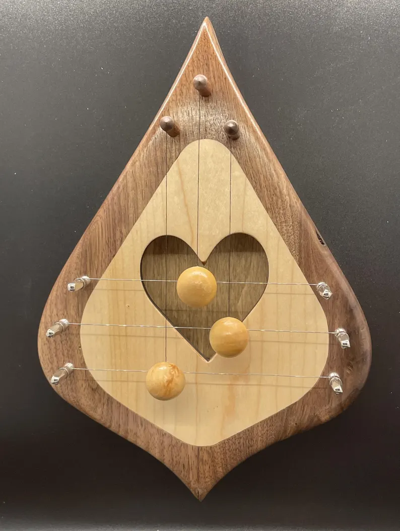 3 String door harp with solid Walnut border with a Maple inlay with a Heart as the sound hole. Finished with a clear Natural Finish. Handmade in the USA!
