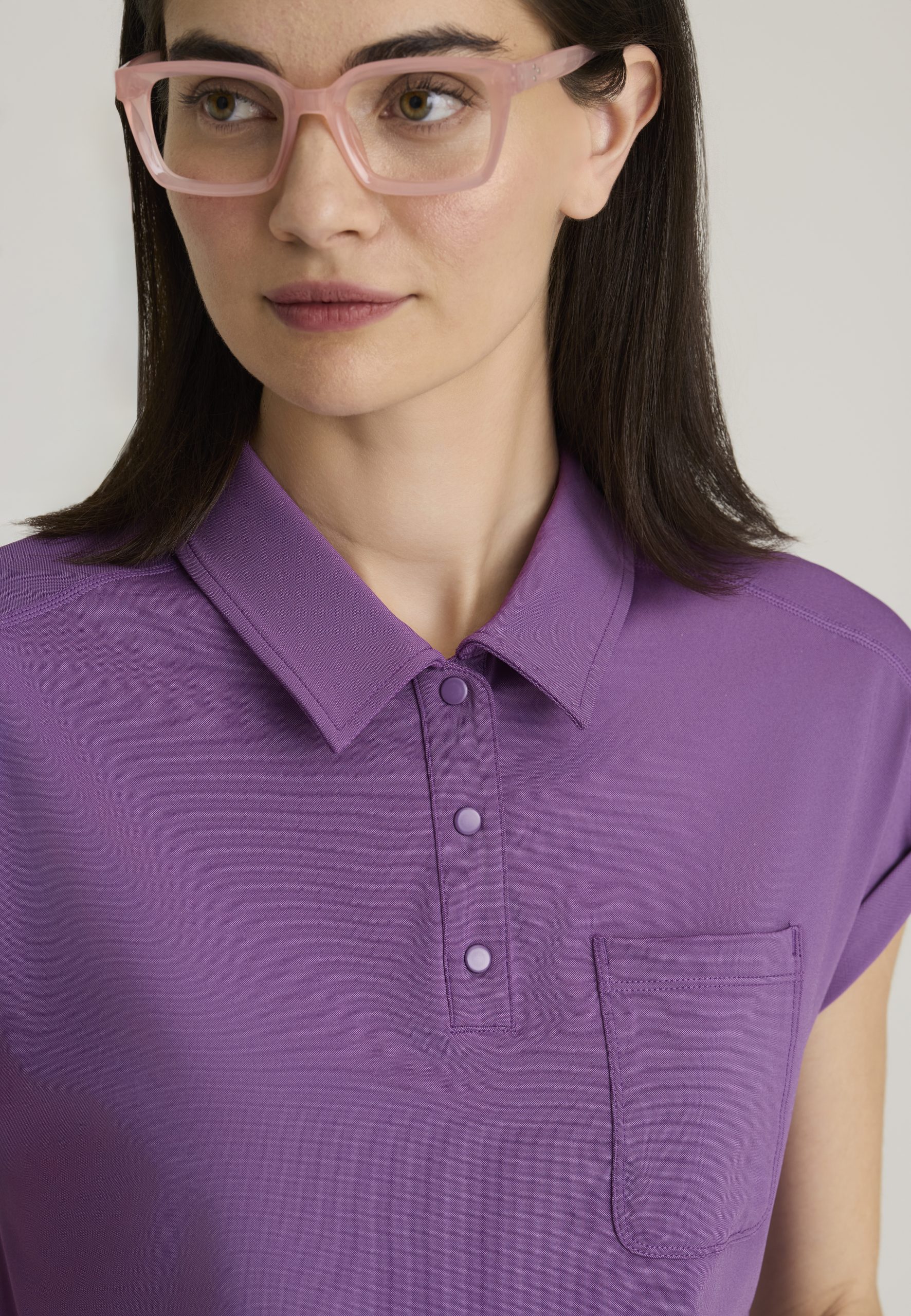 The thoughtfully designed Renew Knit Top features a single chest pocket for easy storage, a stylish collar with a snap placket, and chic dolman sleeves for added flair. The back yoke with a box pleat ensures unrestricted movement, while the wide high-low hem offers a trendy silhouette. Crafted with antimicrobial finish to combat mold and mildew, this durable top also boasts soil-release fabric and moisture-wicking Spandex stretch for all-day comfort.