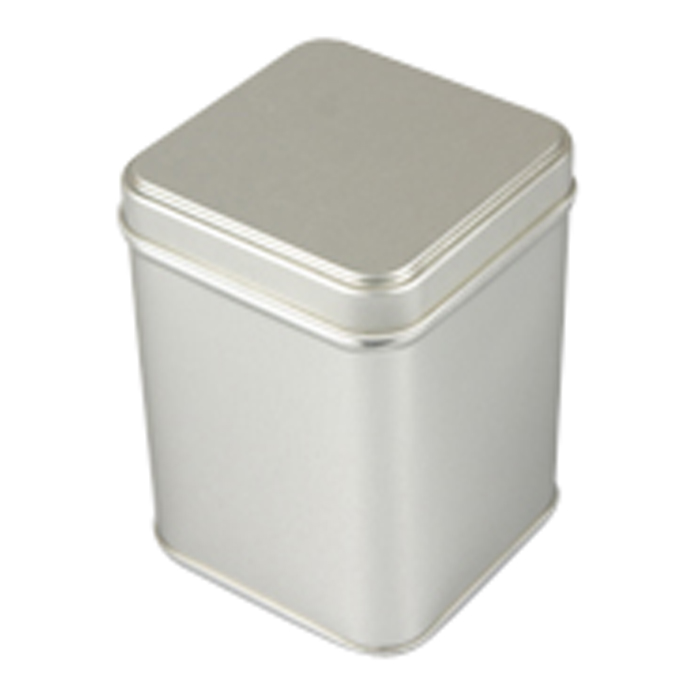 Square Tin with lever lid Size: 76 x 76 x 93 mm (h) Unit Price: $2.45 + gst Colour: Matt Silver Carton Qty: 120 pcs Carton Price: $294 + gst Carton Size: 48 x 40 x 40 cm (h) Carton Wt: 12 kgs